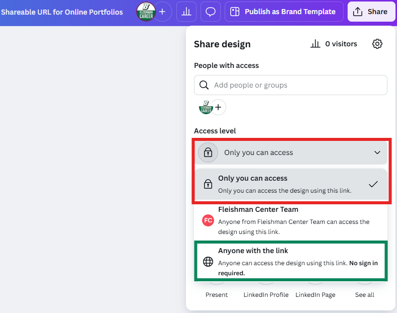 | Make your portfolio links accessible! | Make sure the links you provide on your application materials are viewable to an outside audience. Some tools, like Canva, require you to change the settings on the shareable link to make it viewable to everyone. |